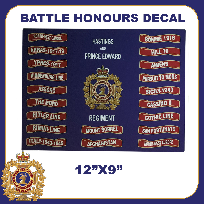 The Hastings & Prince Edward Regiment Brooch Price: $50.00The Hastings & Prince Edward Regiment Blazer Crest Price: $25.00The Hastings & Prince Edward Regiment Neck Tie Price: $35.00Flask Price: $25.00Beer Glass Price: $25.00Coffee Mug Price: $12.00 eachDecal: 2″X4″ Price: $2.00 eachCell Phone Decals: Set of 4 Price: $2.00Folding Knife Price: 27.00Dog Tags Price: $6.00Decal: Assault Pioneer Price: $2.00Decals: Outside/Inside Perfect for car windows. Price: $2.00Battle Honours Large Decal 12″x9″ Price: $12.00FLAGS: 12″x24″ $25.00 3’X6′ $90.00Green Assault Pioneer Cotton T-Shirt Price: 10.00Toques – assorted colours $15.00Green Cotton T-Shirt Price: $28.00GREEN Ball Cap Price: $25.00Blue Ball Cap Price: $20.00Polyester T-Shirt Price: $35.00Regiment T-Shirt Price: $20.00Regiment Hoodie Price: $50.00Regiment Sweatshirt Price: $40.00Royal Blue Golf Shirt CLEARANCE ITEM SIZE S and MEDIUM ONLY $30.00Navy Blue Golf Shirts – $40SOMME HOODIE Price: $50.00SOMME T-SHIRT Price: $20.00SOMME SWEATSHIRT Price: $40.00ASSORO RED SWEATSHIRT Price: $40.00ASSORO RED HOODIE Price: $50.00ASSORO COMPANY T-SHIRT Price: $20.00Red Beret = $25Boot Blousers $2.00 per pair